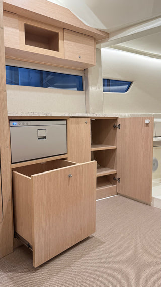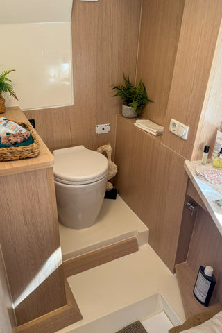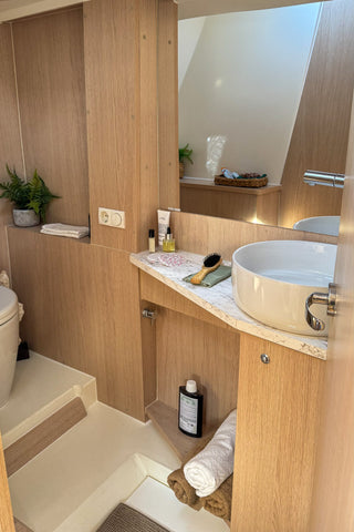 La embarcación cuenta con un baño completo, moderno y espacioso, equipado con una ducha diseñada para que puedas estar de pie con total comodidad. Su distribución ha sido cuidadosamente pensada para ofrecer privacidad y facilidad de uso, proporcionando el lugar perfecto para disfrutar de tu tiempo a bordo sin renunciar al confort.